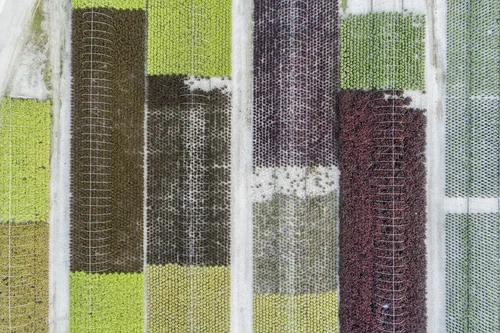 Some of the grid-organized images in this section are part of a series titled Human Elements, which documents our intervention and impact from a birds-eye view with shots of agricultural production, transportation infrastructures, and the production of varied commodities.